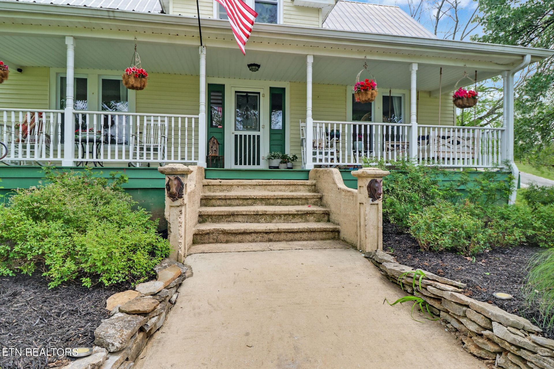 Black wrought iron fencing frames a yellow farmhouse surrounded by vibrant gardens and mature trees. This meticulously maintained 2,000 sq ft, 126-year-old home blends historic charm with modern upgrades and mountain views from every window. Features include a welcoming porch, deck, above ground pool, barn for 7 cars, workshop with apartment, stable generator, gardens, and 5.44 unrestricted acres--perfect for a mini farm lifestyle.